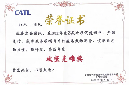 Winning Honor On December 22, 2022, Jiangsu Beiren won the annual Overcoming Difficulties Award issued by CATL! Jiangsu Beirens project team created efficient operations in projects such as capacity delivery and cost improvement during the Z